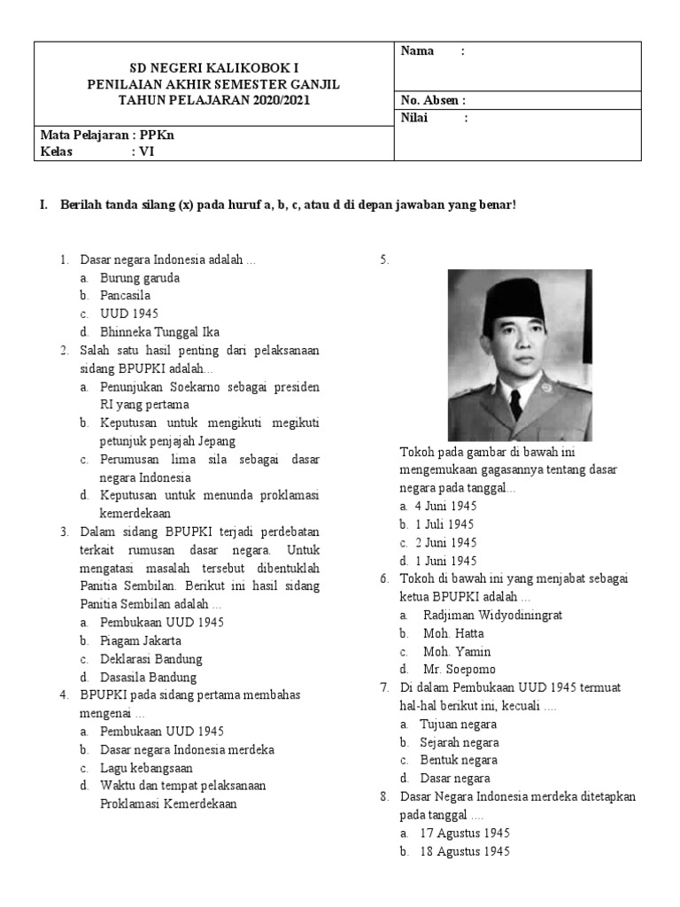 Ujian Akhir Semester (UAS) untuk mata pelajaran Pendidikan Kewarganegaraan (PKN) kelas 6 semester 1 merupakan momen penting bagi siswa. Ujian ini bukan hanya sekadar menguji hafalan materi, tetapi juga mengukur pemahaman mendalam tentang nilai-nilai Pancasila, hak dan kewajiban sebagai warga negara, serta pentingnya persatuan dan kesatuan dalam keberagaman. Artikel ini akan mengupas tuntas berbagai aspek terkait soal UAS PKN kelas 6 semester 1, mulai dari cakupan materi, jenis soal, hingga strategi belajar yang efektif untuk menghadapinya.
